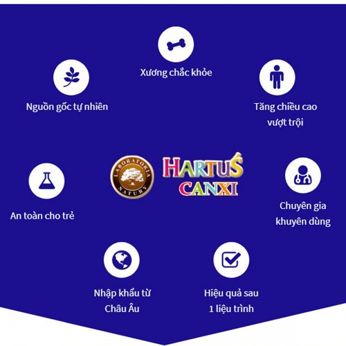 - Canxi sinh học Hartus đã đươc kiểm dịnh khả năng hấp thụ tốt hơn sữa bò 15% tại đại học Barcelona. Do vậy, trong thời gian bé từ 0-2 tuổi, canxi sinh học Hartus là một giải pháp an toàn cho chiều cao của bé.